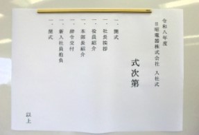 式典では社長をはじめ、役員、本部長より新たに日昭電器の一員となった2名へ歓迎と激励の言葉が贈られました。
